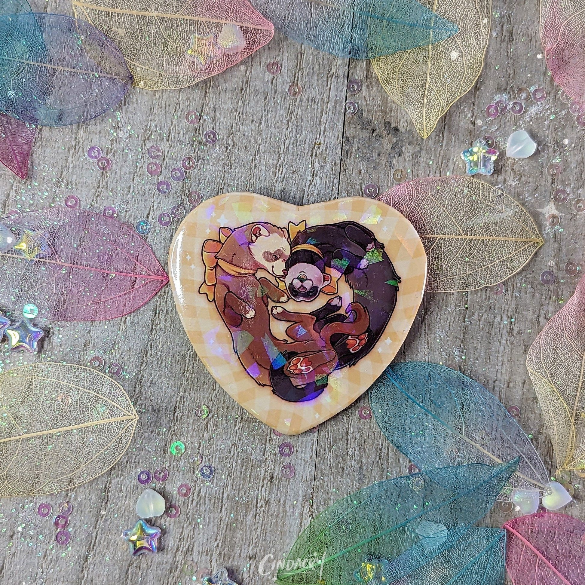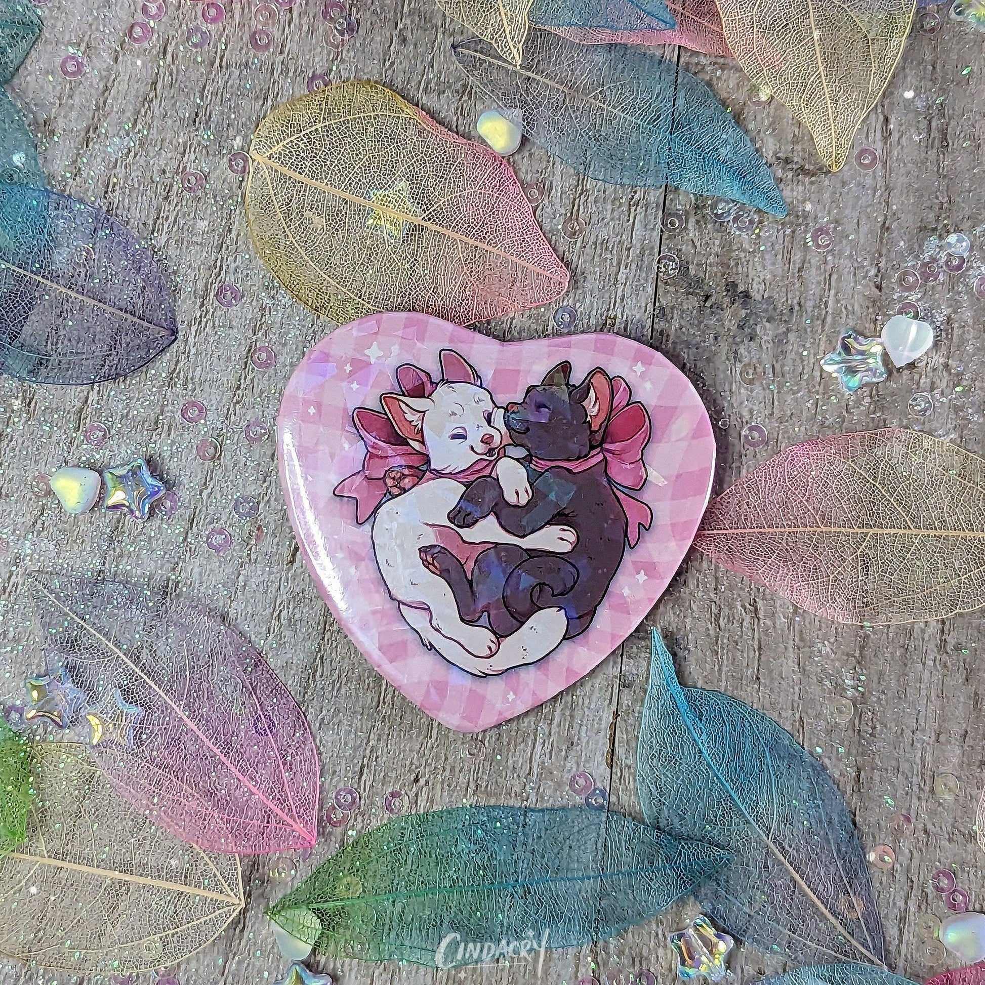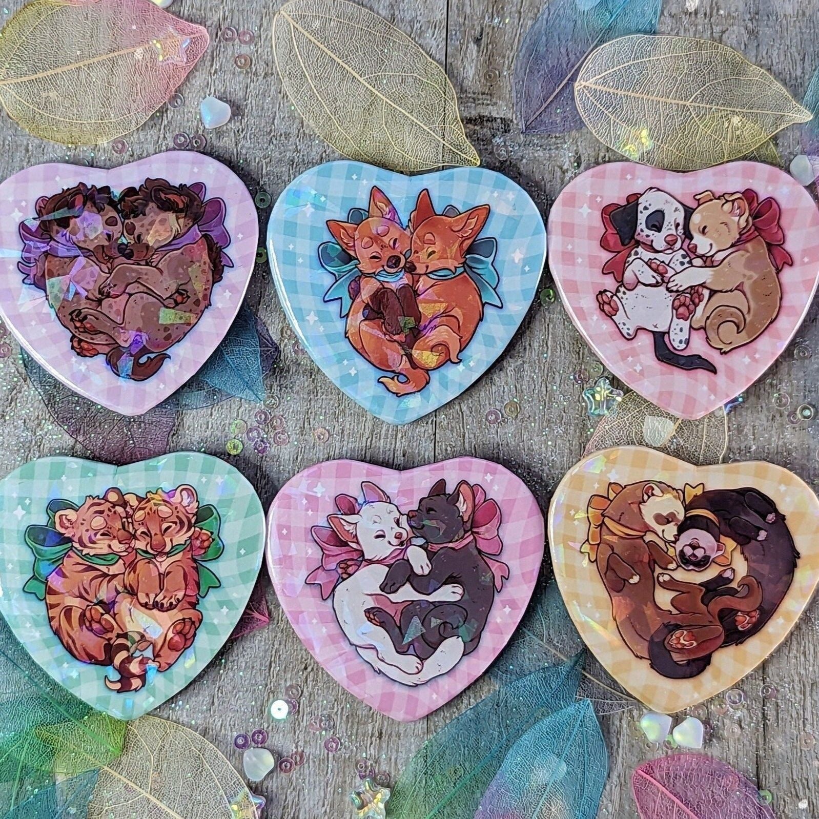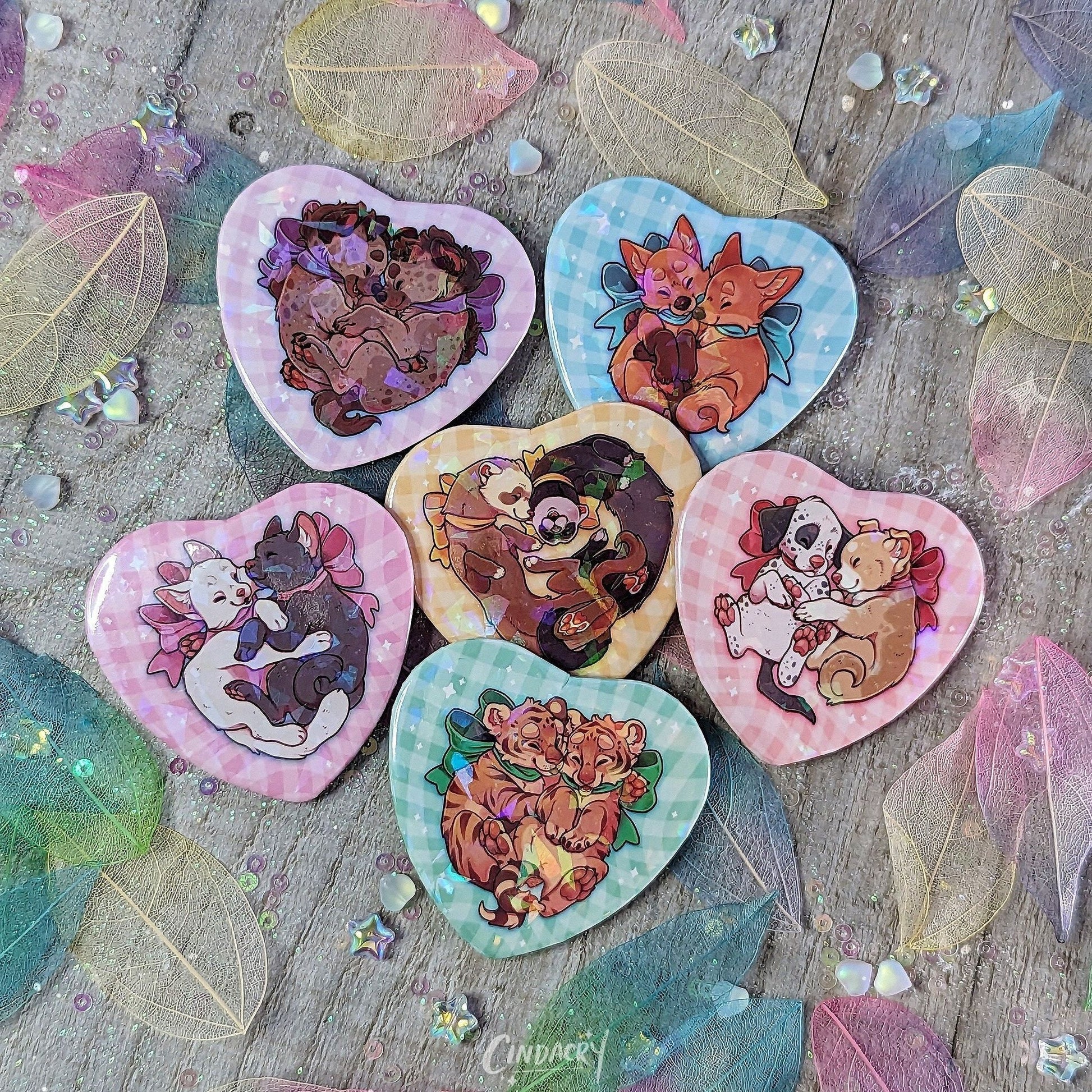 ✨ Preciosas insignias brillantes con forma de corazón que presentan a varios animales abrazándose. Todos los animales descansan sobre mantas de picnic de color pastel. ¡Adiciones perfectas para cualquier atuendo kawaii o bolso Ita! Elige tu animal en el menú desplegable