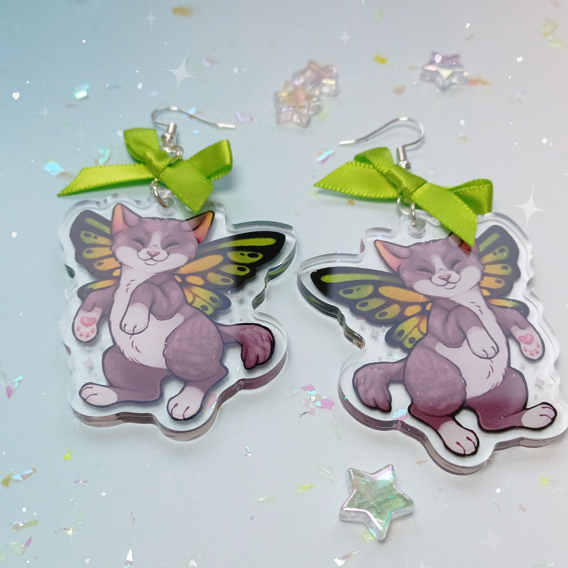 ✨ ¡Un par de pendientes mágicos de gatitos dulces y mágicos con un gatito con cara dulce! Con destellos, ojos soñolientos y grandes alas de mariposa verdes, esta preciosidad está lista para aportar una dosis diaria de magia a tu guardarropa.