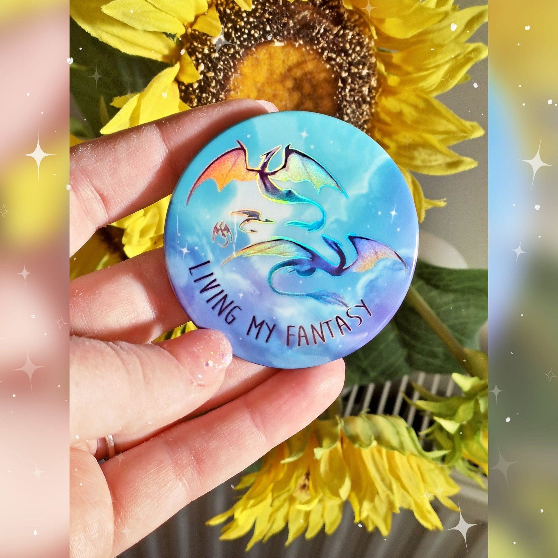 ✨ ¡Una insignia divertida con dragones voladores iridiscentes! ¡Detalles con capas de brillo para un acabado mágico!