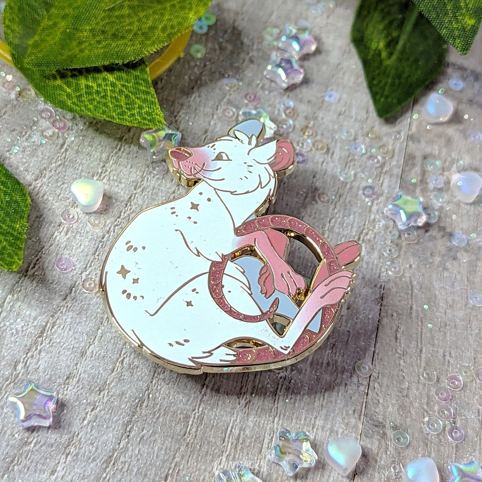 ✨🐀 Una insignia que presenta una rata blanca con detalles en degradado gris. ¡Este pequeño también tiene detalles de brillo en los elementos rosados del diseño!